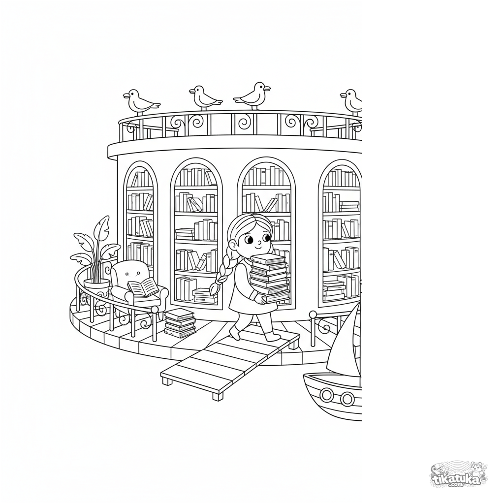 Página para colorear para 10-12 años: una acogedora biblioteca flotante. Escena detallada con bibliotecaria, velero, gaviotas y libros para colorear.