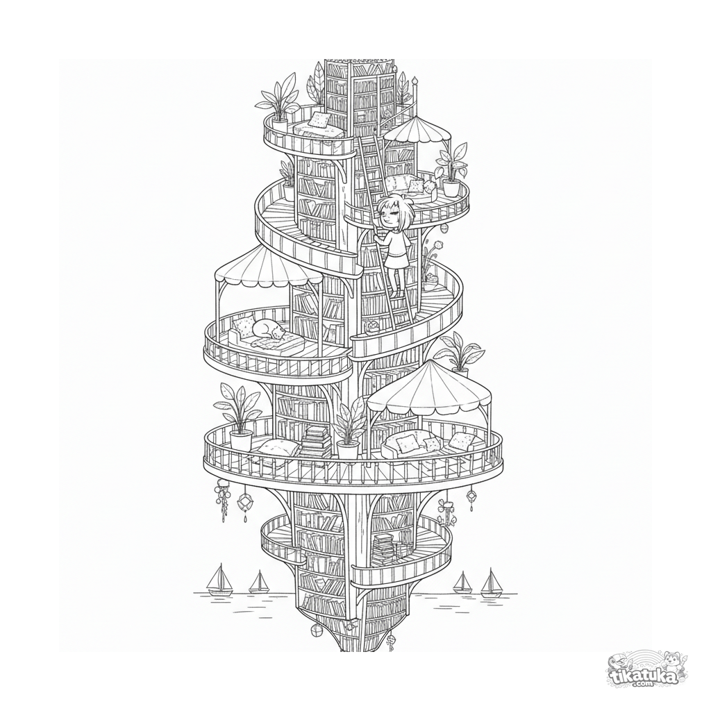 Página para colorear para niños 10-12: una plataforma biblioteca flotante de varios niveles con rampa espiral, estanterías y rincones de lectura. Un bibliotecario en escalera.