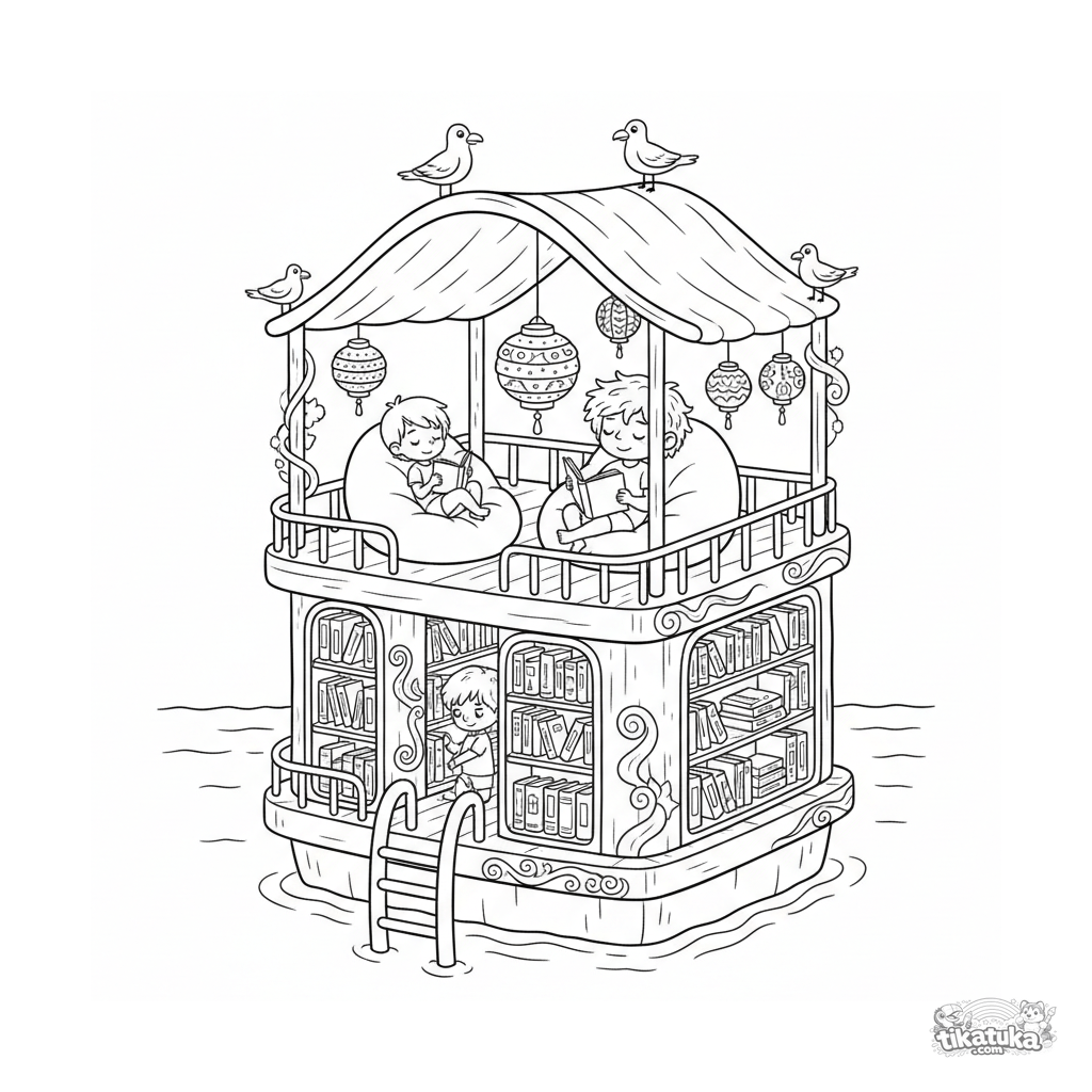 Página para colorear para 10-12 años: una acogedora biblioteca flotante en una plataforma en el mar. Estanterías de libros, rincón de lectura, farolillos y escalera. Escena detallada y tranquila.