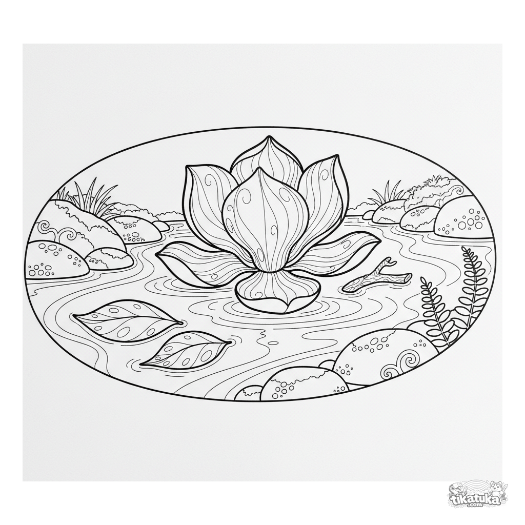 Página para colorear intrincada para 10-12 años: una flor de magnolia flota en un arroyo del bosque en estilo art nouveau.