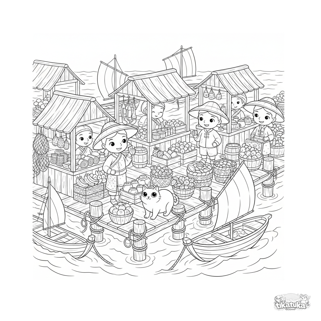 Página para colorear de una plataforma de mercado flotante en el mar para 10-12 años. Escena detallada con puestos, barcos y gente con sombreros.