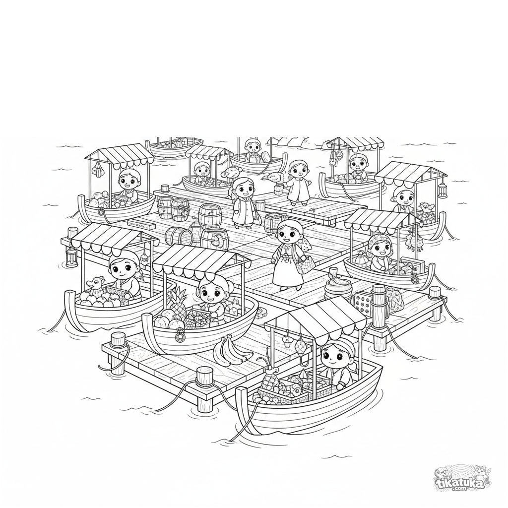 Página para colorear: un bullicioso mercado flotante en plataformas de madera en el mar para niños de 10-12 años. Escena detallada con barcos, puestos, compradores y un faro distante.