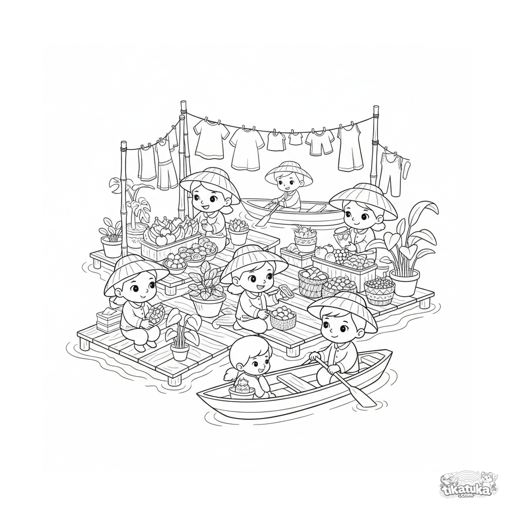 Página para colorear para 10-12 años: un bullicioso mercado flotante en plataformas de madera en el mar. Vendedores, clientes en barcos, mercancías y decoraciones. Escena compleja y multicapa con detalles.