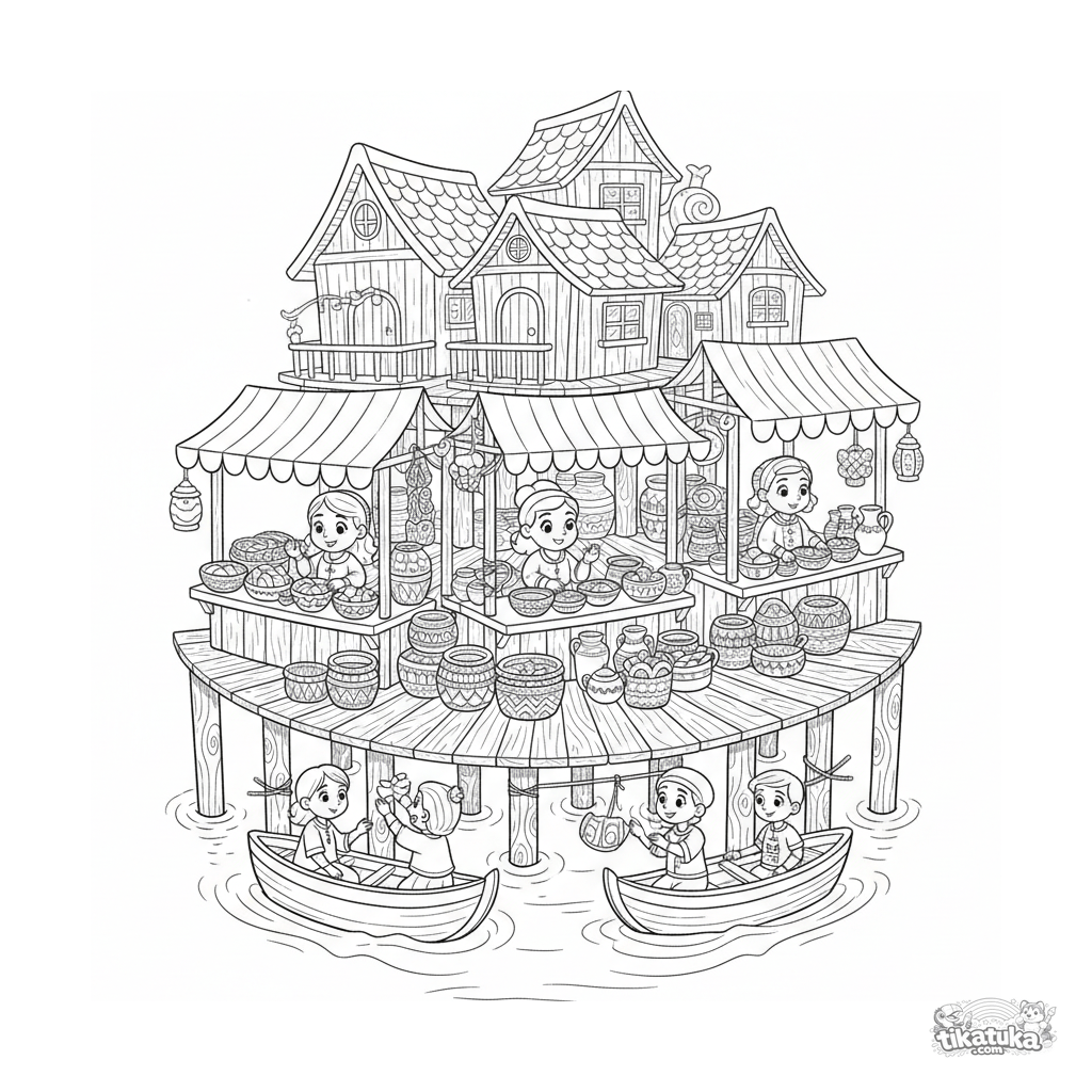 Página para colorear compleja de un mercado flotante con casas sobre pilotes para 10-12 años. Muchos detalles: barcos, comerciantes, mercancías.