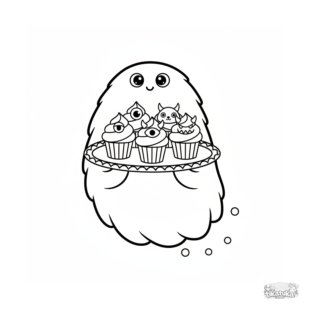 Página muy simple para colorear para niños 2-3: un monstruo flotante como una nube lleva una bandeja de magdalenas sobre un picnic. Escena minimalista con formas grandes.