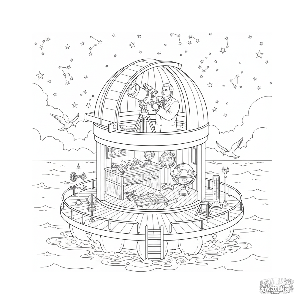 Página para colorear detallada de un observatorio flotante en estilo grabado vintage para 10-12 años. Astrónomo, telescopio, cartas estelares.