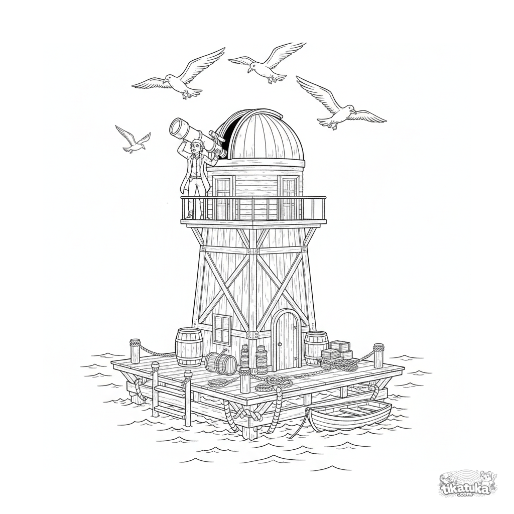 Página para colorear para 10-12 años: un observatorio marino flotante detallado con telescopio en una plataforma de madera. Escena compleja con científico, aves marinas y detalles náuticos.