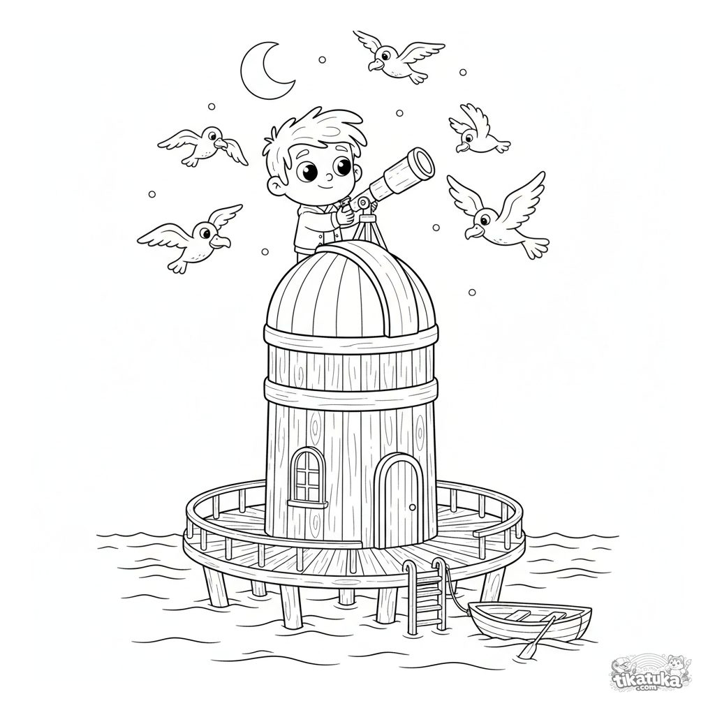 Página para colorear para 10-12 años: un observatorio flotante en el mar con telescopio. Escena detallada con astrónomo, aves y bote para colorear creativamente.