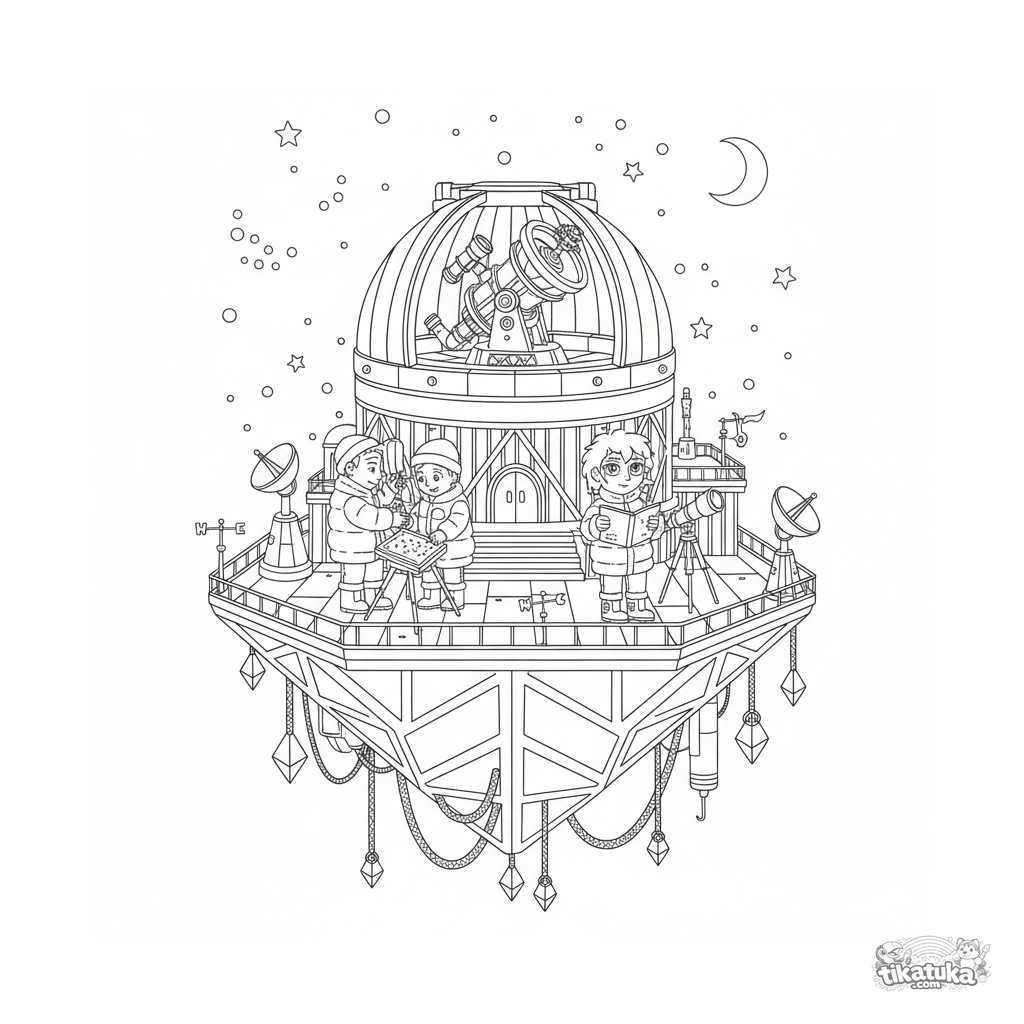 Página para colorear compleja para niños de 10 a 12 años: un observatorio flotante detallado con telescopios en una plataforma de varios niveles en mar abierto. Astrónomos, cartas estelares, equipo.