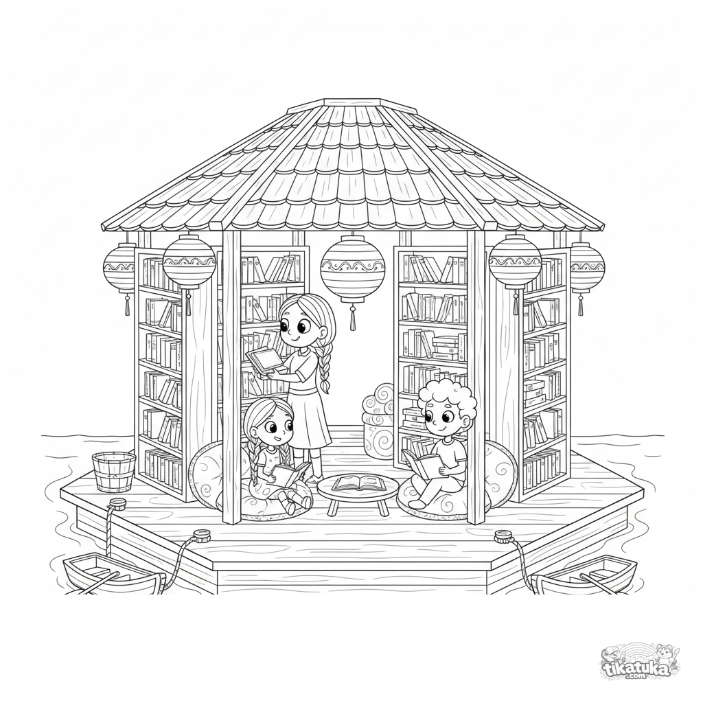 Página para colorear detallada para niños de 10 a 12 años: una acogedora biblioteca flotante en una plataforma hexagonal en una bahía tranquila. Estanterías, lectores, bibliotecaria y faroles decorativos.
