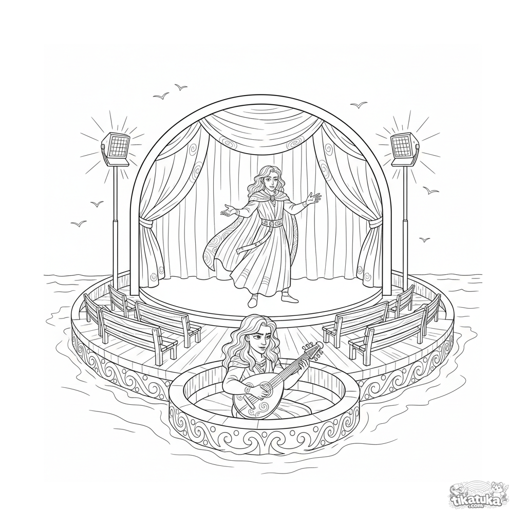 Página para colorear de un teatro flotante al aire libre en plataforma marina para 10-12 años. Detalles: escenario con cortinas, bancos, actor con capa, músico.