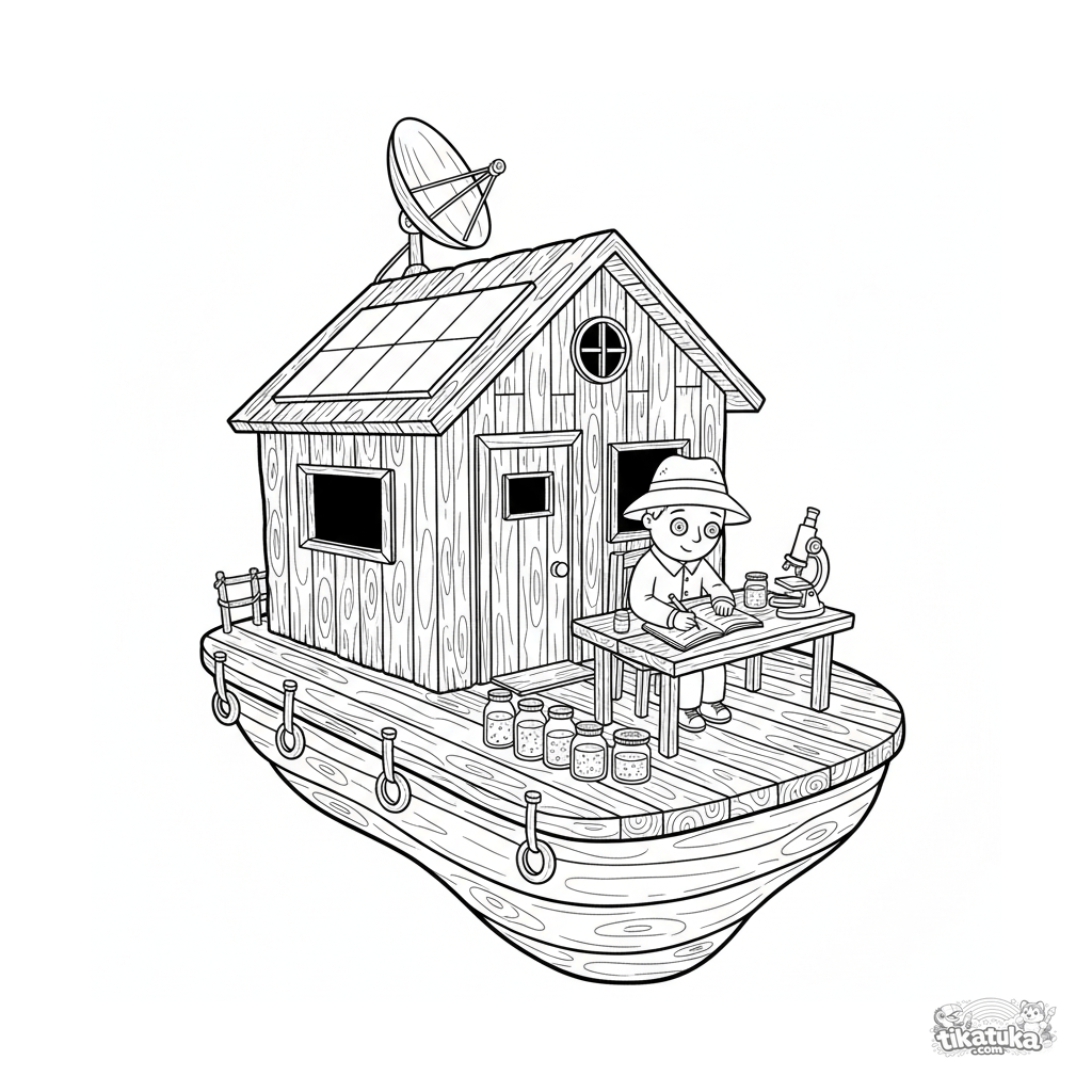 Página para colorear para 10-12 años: una cabaña de investigación flotante desgastada con antena parabólica en una plataforma compacta en el mar. Un investigador registra datos, un microscopio y frascos de muestras en una mesa.