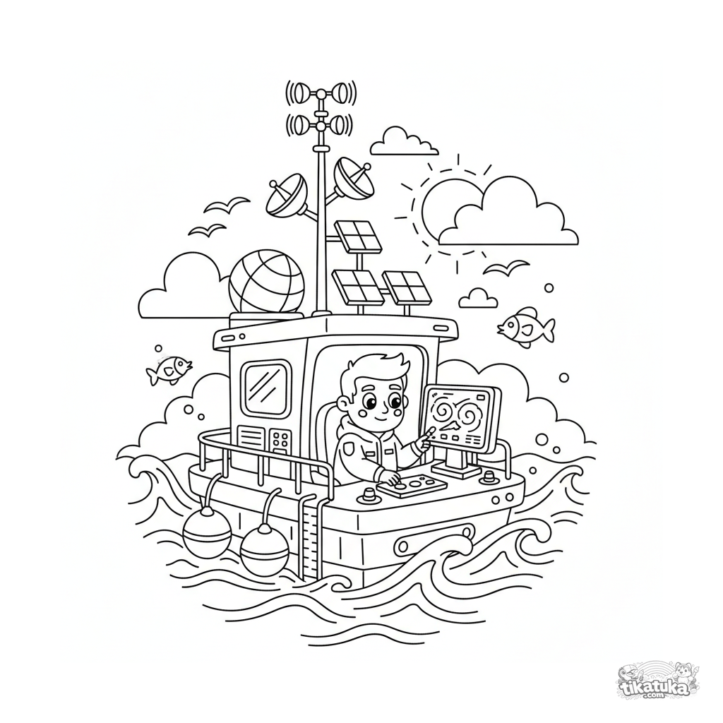 Página para colorear para 10-12 años: una detallada estación meteorológica flotante con mástiles de instrumentos, paneles solares y un meteorólogo monitoreando una tormenta.