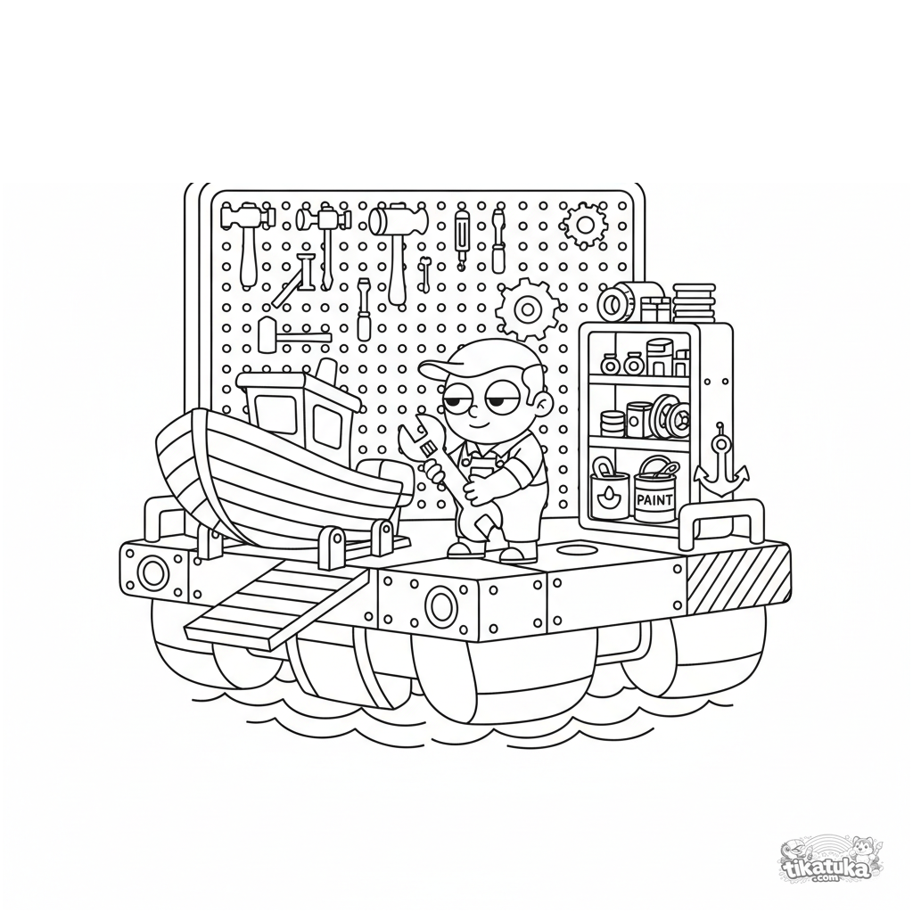 Página para colorear geométrica de un taller flotante de reparación de barcos en una plataforma marina para 10-12 años. Un mecánico trabaja con herramientas, un barco está en una rampa.
