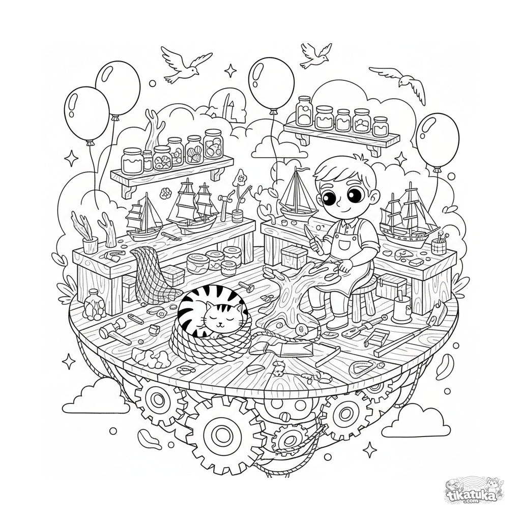 Página para colorear para 10-12 años: un taller flotante creativo en una plataforma marina. Abundantes detalles con herramientas, barcos modelo, artesano trabajando y gato durmiendo.