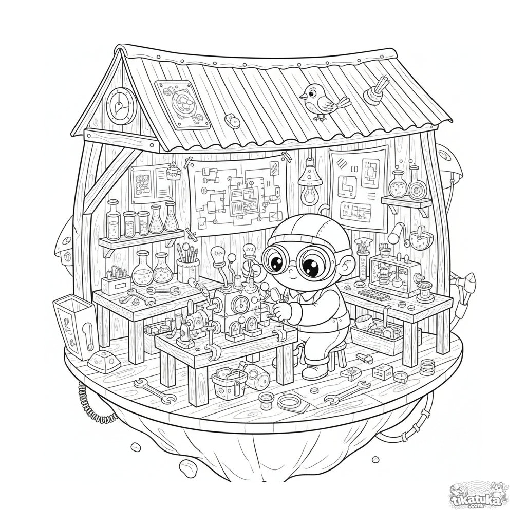 Página para colorear para 10-12 años: un taller desordenado de inventor flotante en una plataforma en el mar. Un inventor con gafas ajusta un dispositivo, rodeado de bancos de trabajo, herramientas y planos.