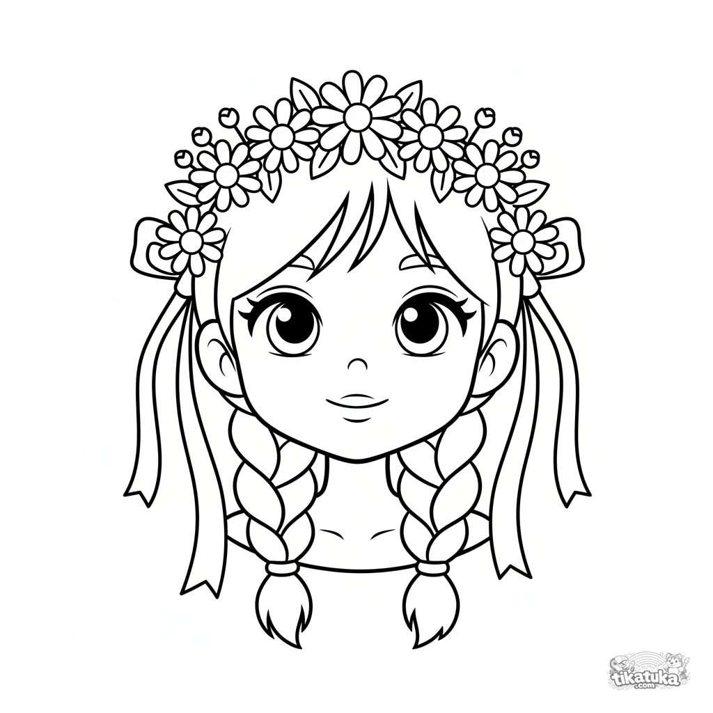 Página para colorear para toddlers 2-3: una niña sonriente con una corona de flores silvestres y cintas. Formas grandes y simples.