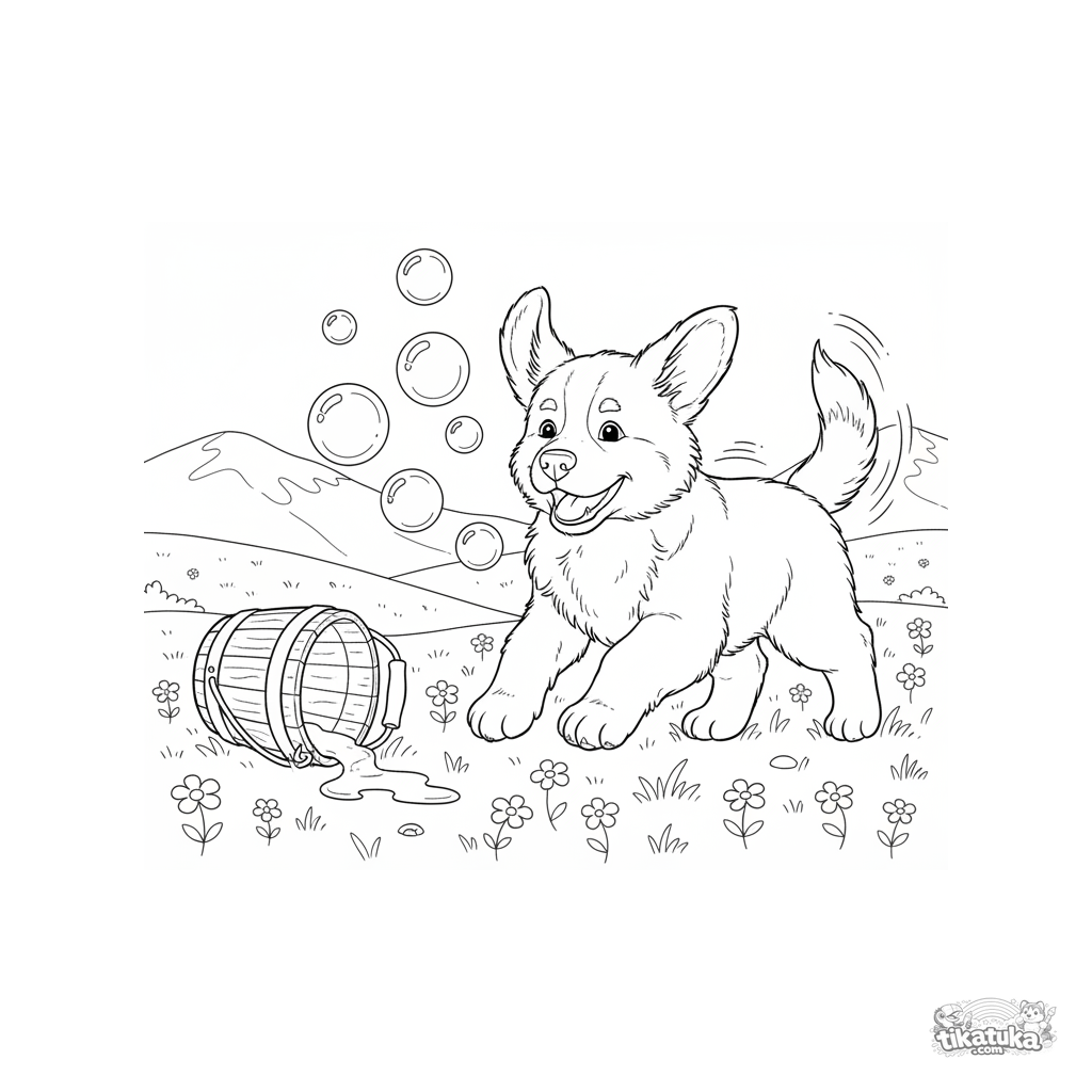 Página para colorear de un cachorro de montaña bernés esponjoso persiguiendo burbujas de jabón en un prado de montaña. Para niños de 3-6 años.