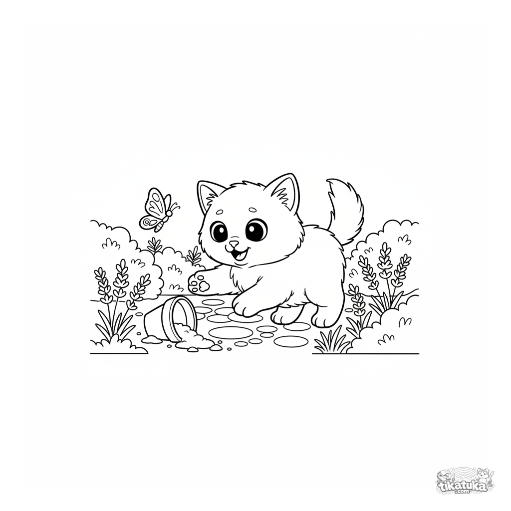 Página para colorear de un gatito esponjoso persiguiendo una mariposa en un jardín de hierbas aromáticas. Ideal para niños de 3 a 6 años.