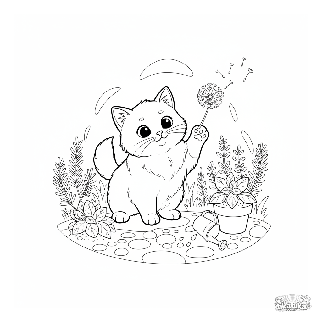 Página para colorear de un gatito Birmano esponjoso persiguiendo una pelusa de diente de león en un jardín de hierbas. Escena linda para niños de 3-6 años.