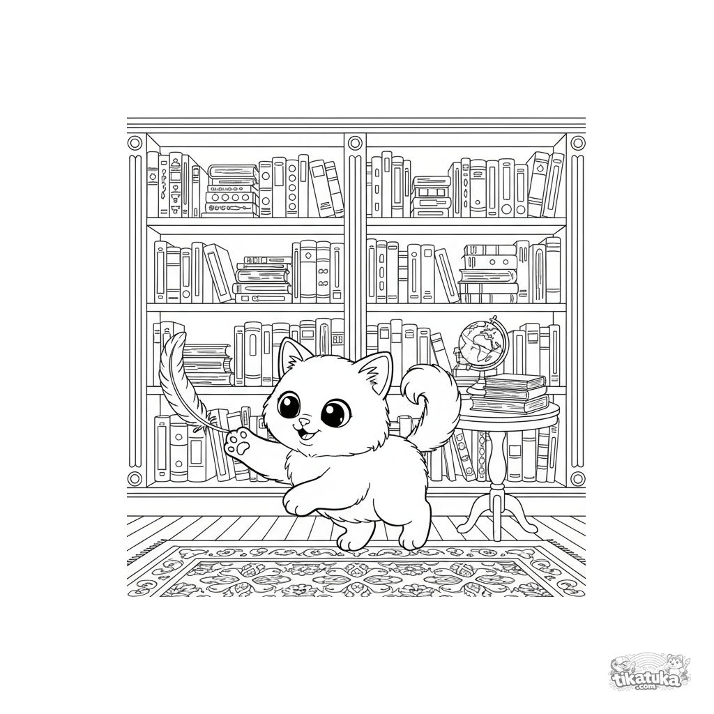 Página para colorear de un lindo gatito Birmano jugando con una pluma en una biblioteca victoriana. Para niños de 3 a 6 años.