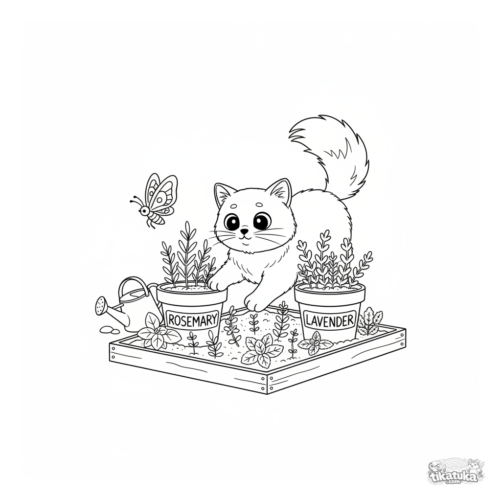 Página para colorear para niños de 4-6 años: un gato esponjoso persigue juguetonamente una polilla en un acogedor jardín de hierbas. Formas simples y una escena linda.