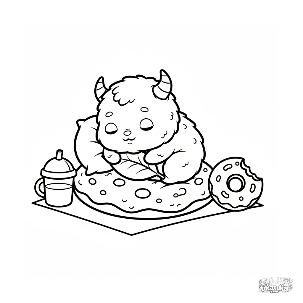Página simple para colorear para niños pequeños de 2-3 años: un bebé monstruo esponjoso durmiendo en una galleta grande en un picnic. Formas grandes, mínimo detalle.