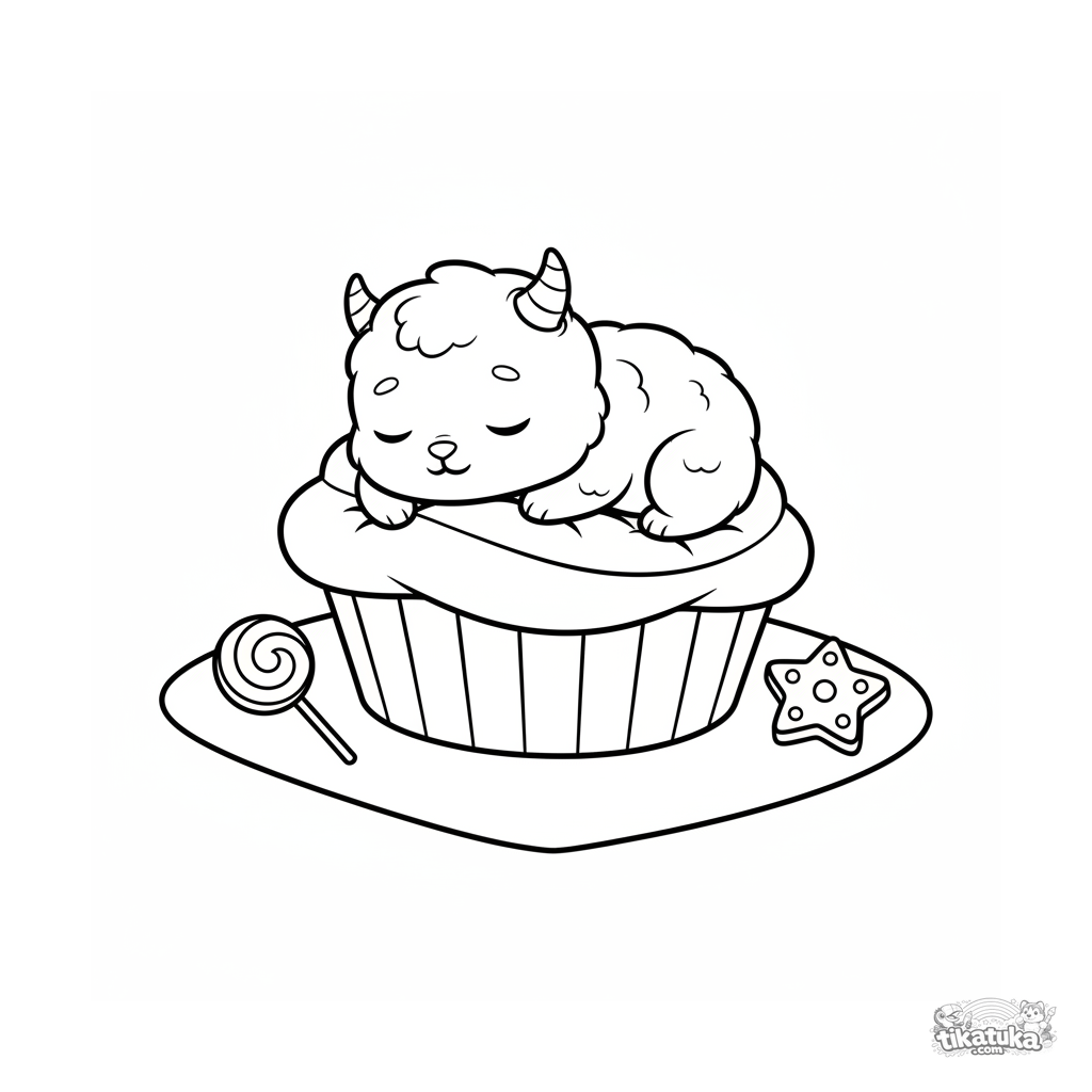 Página simple para colorear para niños de 2-3 años: un bebé monstruo peludo durmiendo en una magdalena gigante en un picnic. Formas grandes, pocos detalles.