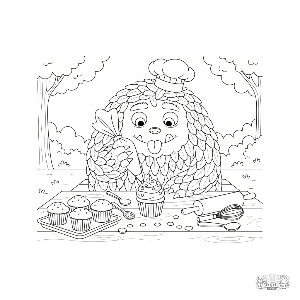 Página para colorear detallada para niños mayores 10-12 años: un monstruo esponjoso con gorro de chef decora meticulosamente un cupcake en un picnic. Muchos detalles: herramientas, sprinkles, texturas.