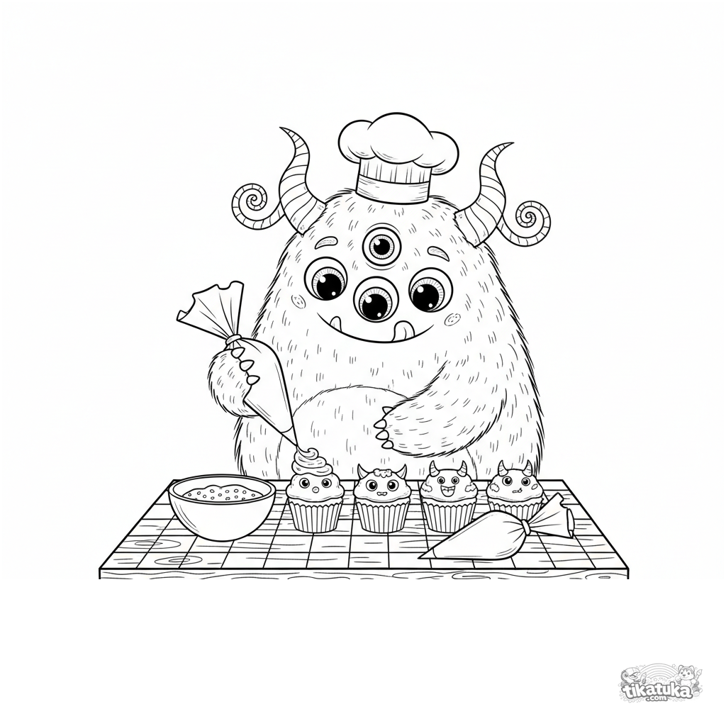 Página detallada para colorear para niños de 10-12 años: un monstruo esponjoso con gorro de chef decorando magdalenas en un picnic.