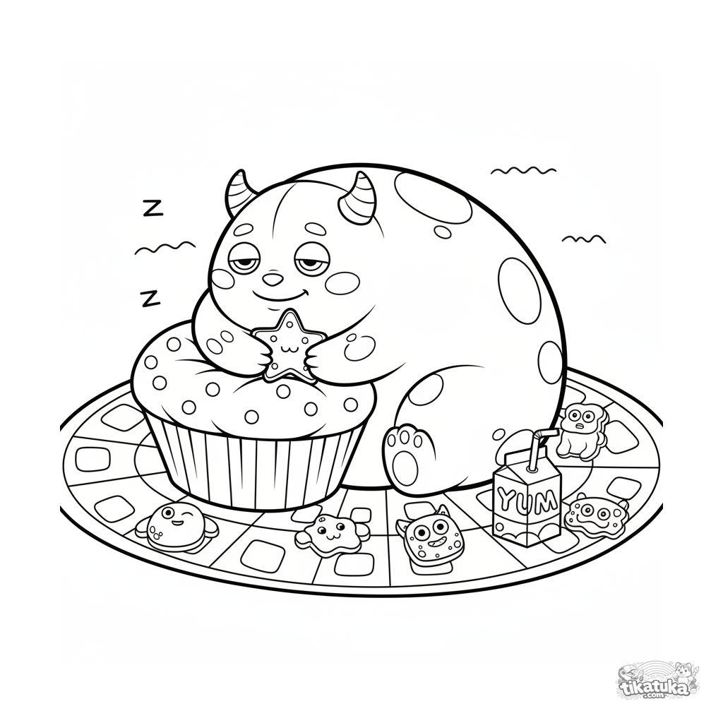 Página para colorear para niños pequeños: un monstruo esponjoso durmiendo en una almohada de magdalena en un picnic. Formas grandes y simples para 2-3 años.