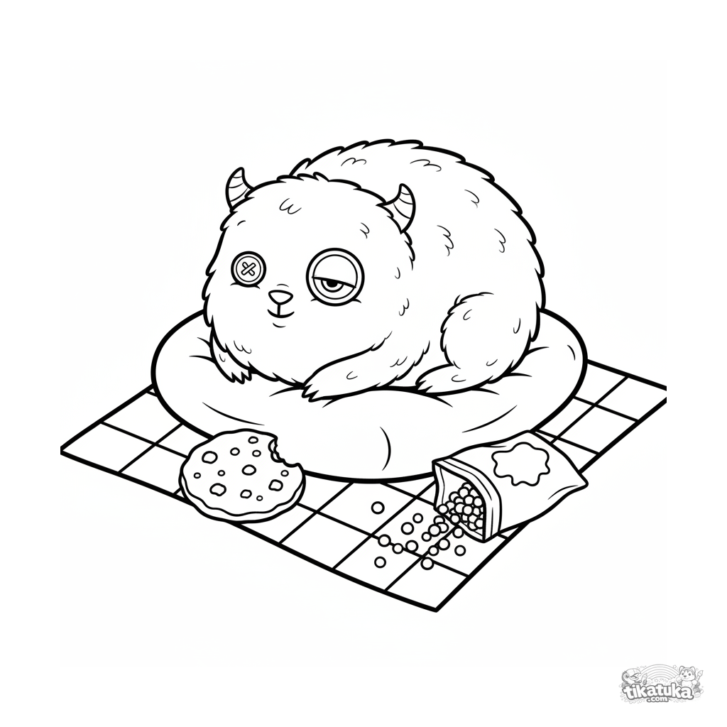 Página para colorear para bebés 2-3: un monstruo esponjoso durmiendo en una almohada de malvavisco después de un picnic. Formas grandes y simples.