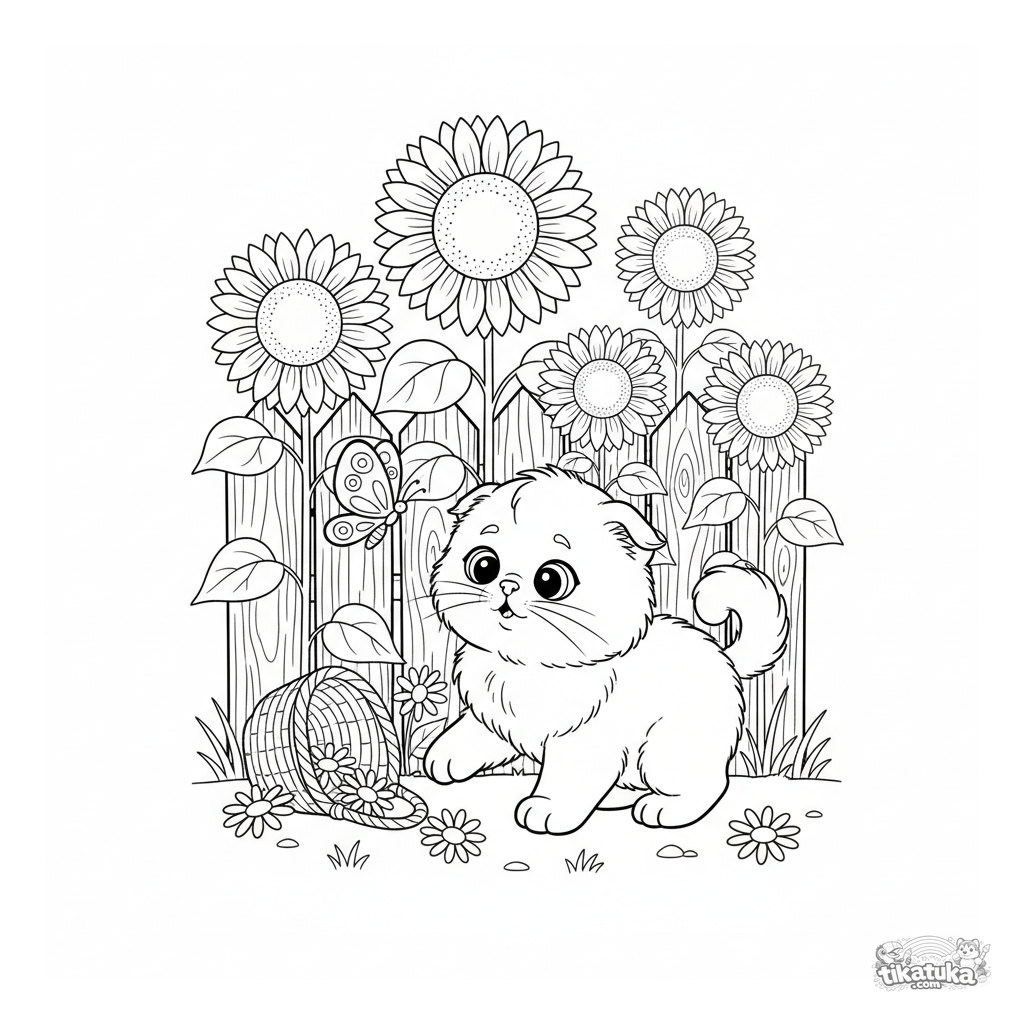Página para colorear de un gatito esponjoso persiguiendo una mariposa entre girasoles gigantes. Para niños de 3 a 6 años. Una linda escena de jardín.