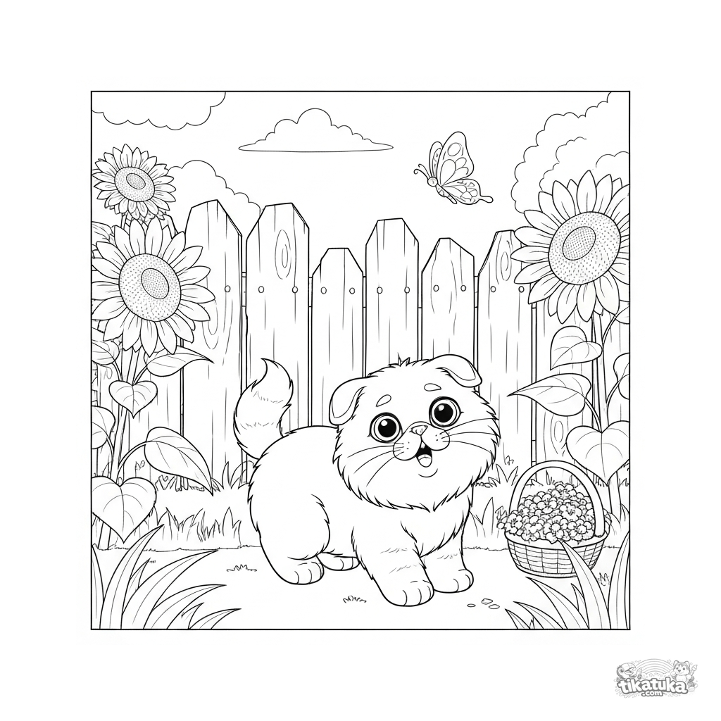 Página para colorear de un gatito esponjoso persiguiendo una mariposa en un campo de girasoles. Para niños de 3-6 años. Escena linda con una valla y una cesta.