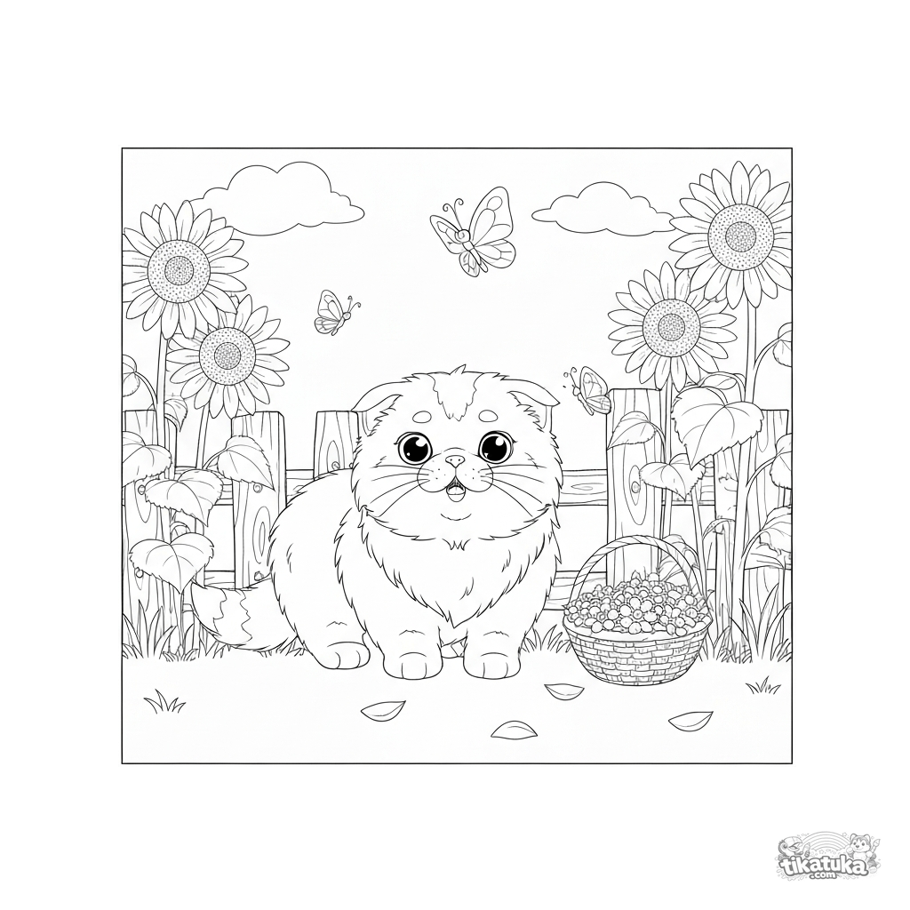 Página para colorear de un gatito esponjoso persiguiendo una mariposa entre girasoles. Para niños de 3 a 6 años. Escena linda de jardín.