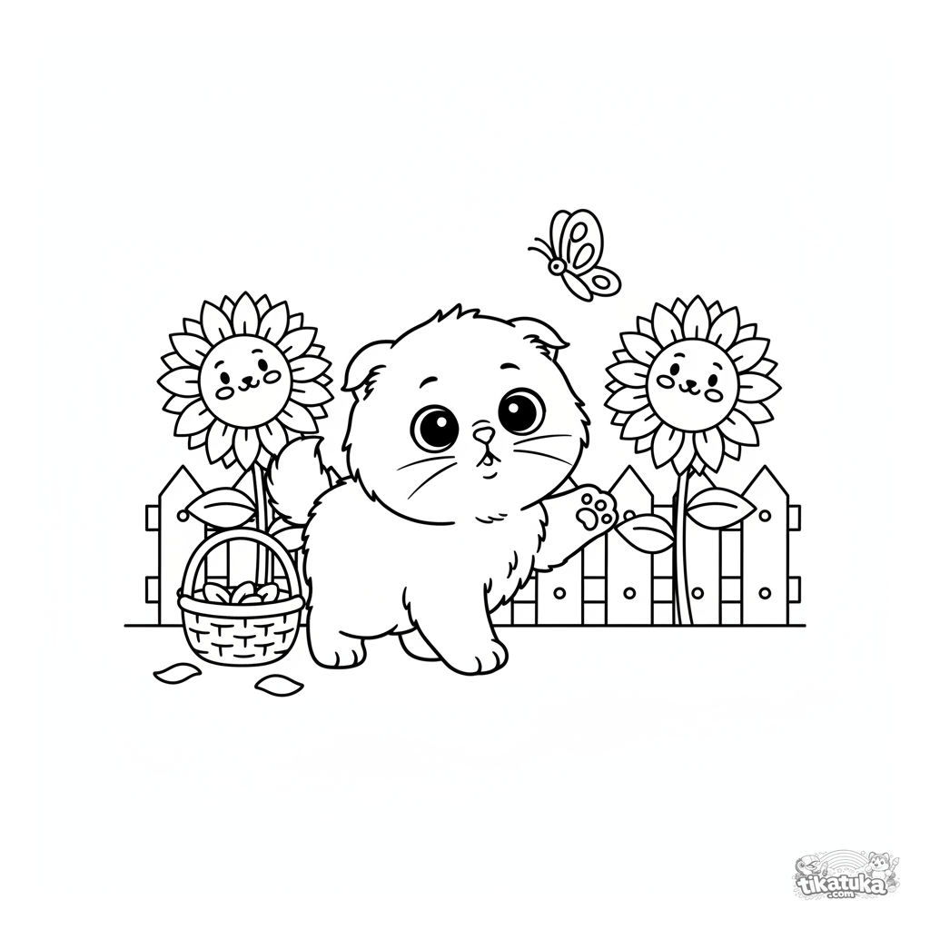 Página para colorear para niños pequeños: un gatito esponjoso persigue una mariposa entre girasoles. Contornos simples, detalles grandes, perfecto para 2-4 años.