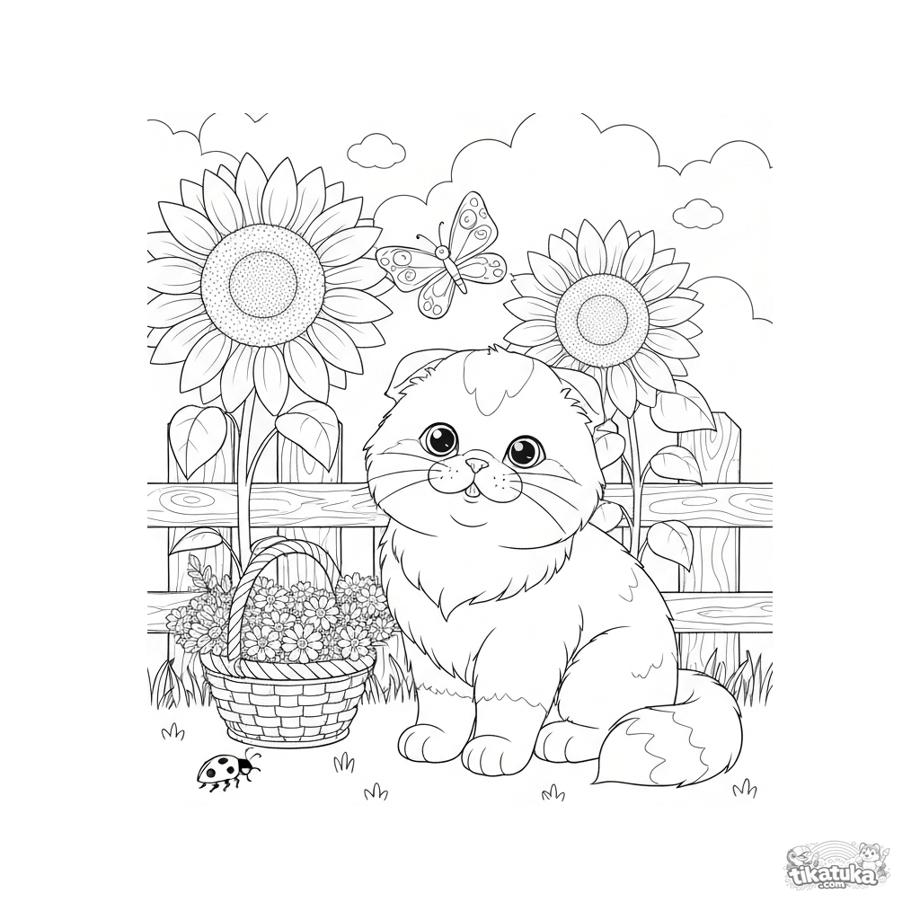 Página para colorear de un gatito esponjoso en un jardín entre girasoles gigantes. Para niños de 3 a 6 años. El gatito mira sorprendido a una mariposa, con una cesta de flores cerca.