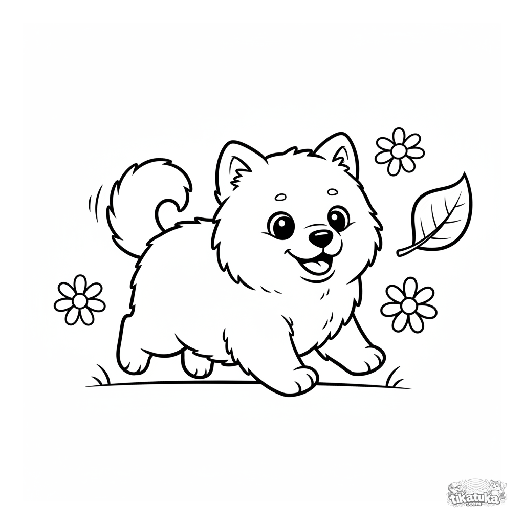 Página para colorear para niños pequeños: un cachorro de Samoyedo esponjoso persigue felizmente una hoja en un prado. Formas grandes y simples con amplios márgenes blancos.