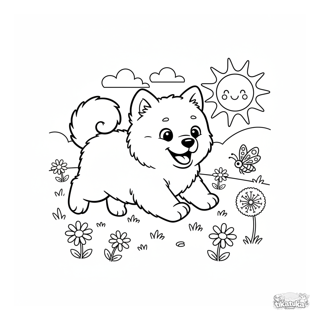 Página para colorear para niños de 4-6 años: un cachorro de Samoyedo esponjoso persigue felizmente una polilla en un prado de margaritas. Formas simples y una escena adorable.