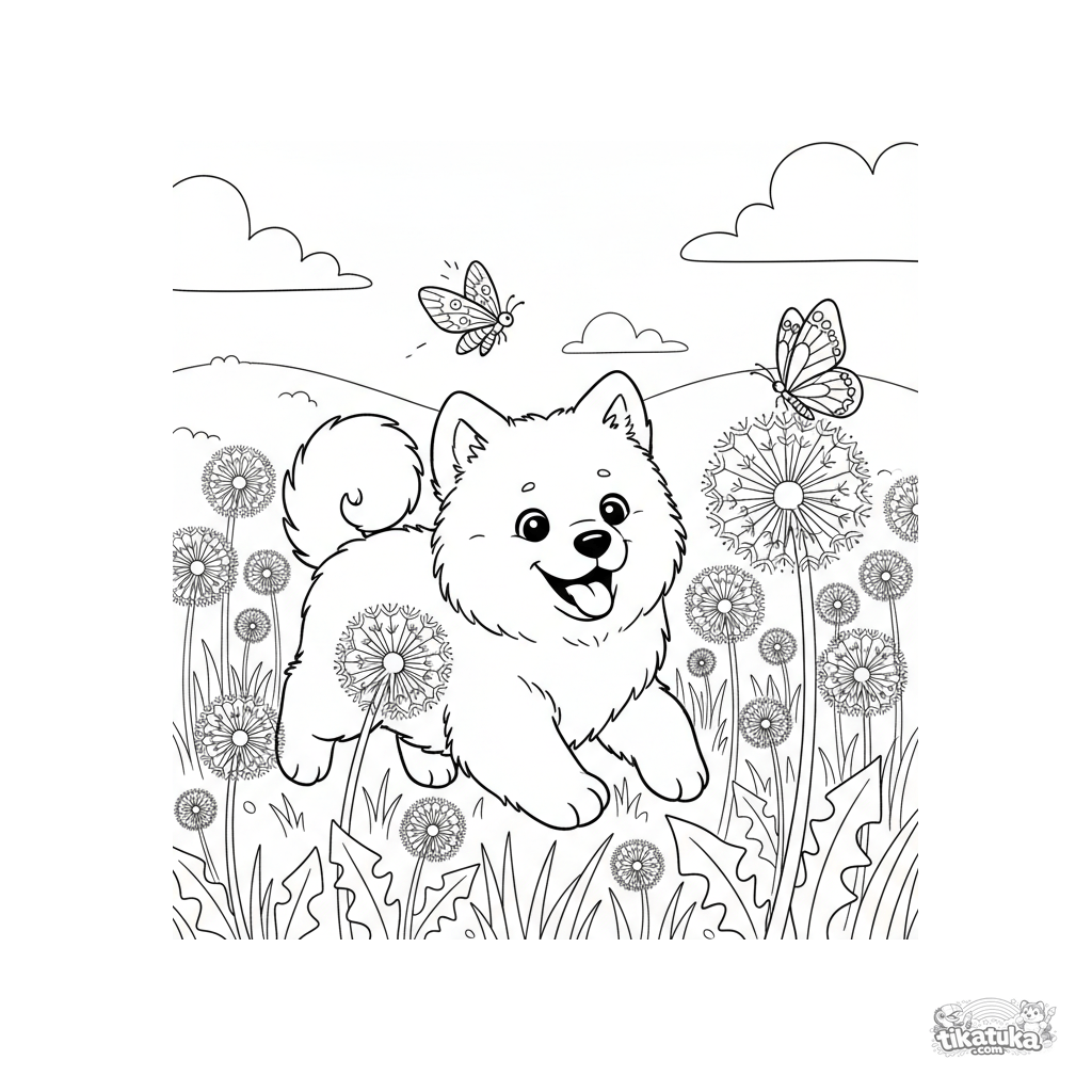 Página para colorear de un cachorro de Samoyedo esponjoso persiguiendo felizmente una polilla en un prado de dientes de león. Para niños de 4 a 6 años.