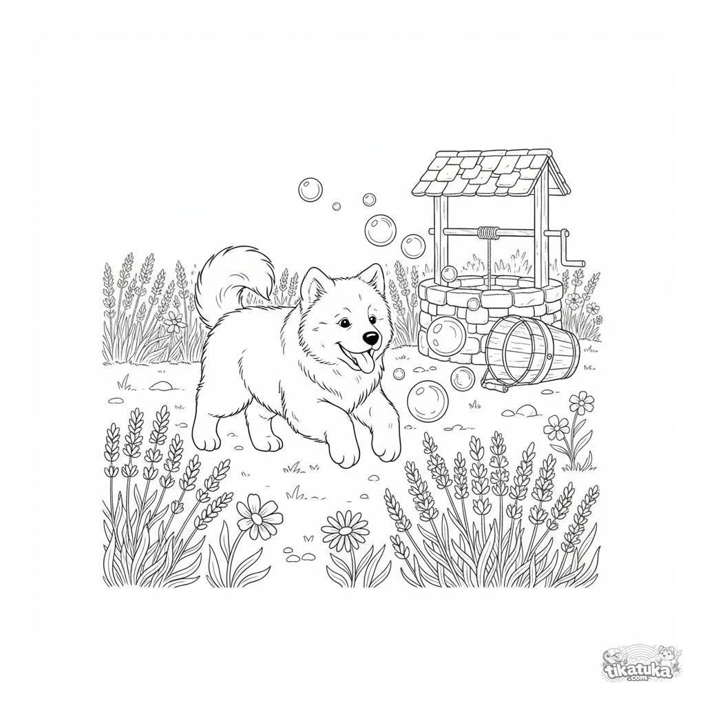 Página para colorear de un cachorro Samoyedo esponjoso persiguiendo burbujas de jabón en un campo de lavanda en flor. Para niños de 3 a 6 años.