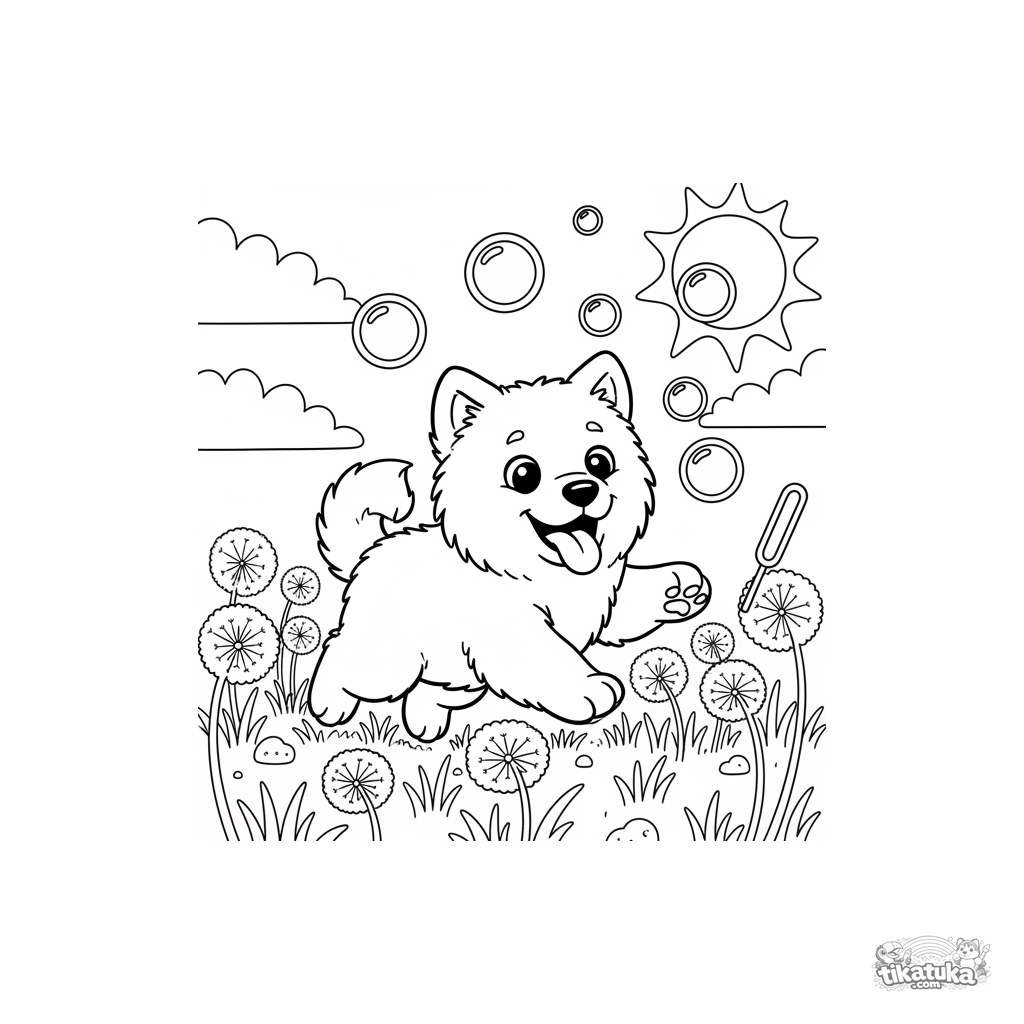 Página para colorear de un cachorro de Samoyedo esponjoso persiguiendo burbujas de jabón en un prado de dientes de león. Para niños de 3-6 años.