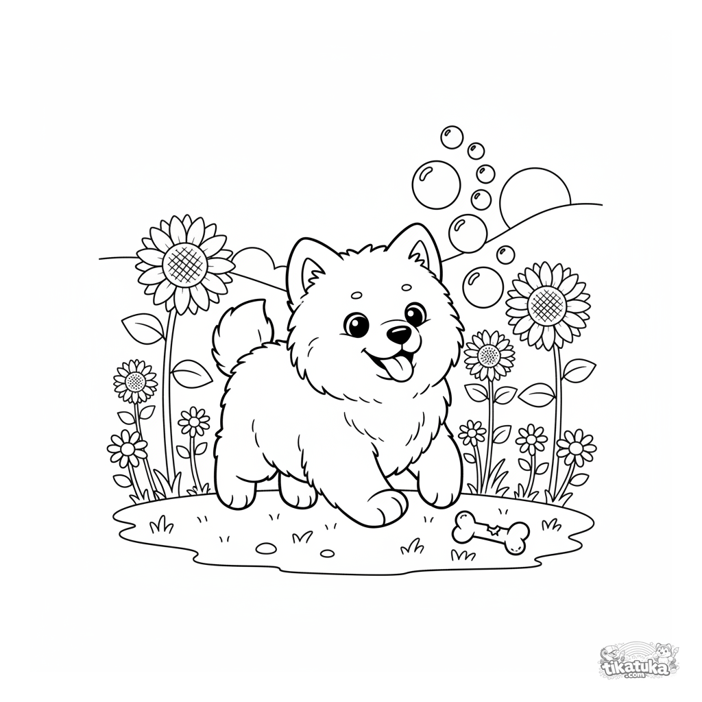 Página para colorear de un cachorro de Samoyedo esponjoso persiguiendo burbujas en un prado florido. Página fácil para niños de 3 a 6 años.