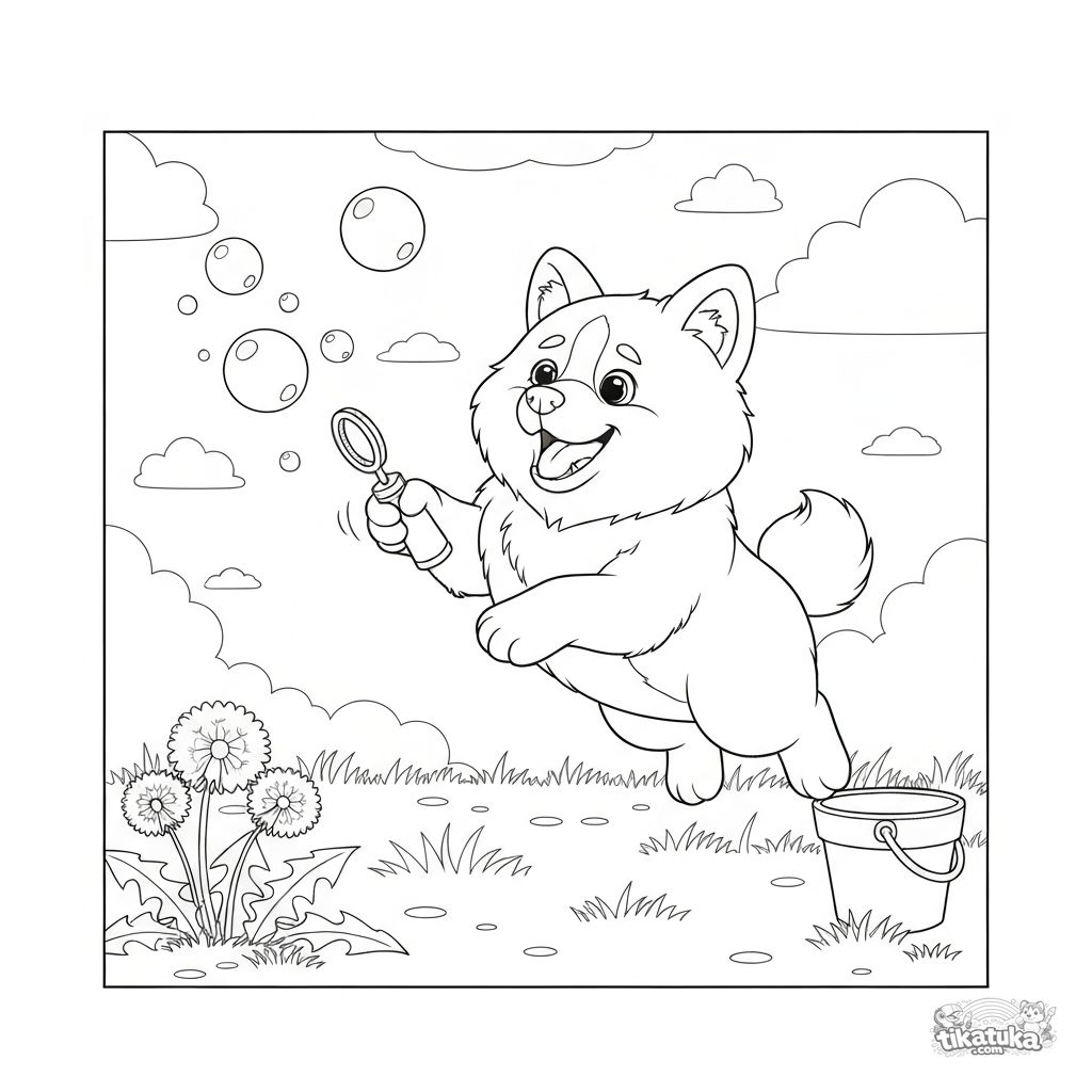 Página para colorear de un cachorro Samoyedo esponjoso persiguiendo burbujas de jabón en un prado. Para niños de 3 a 6 años.
