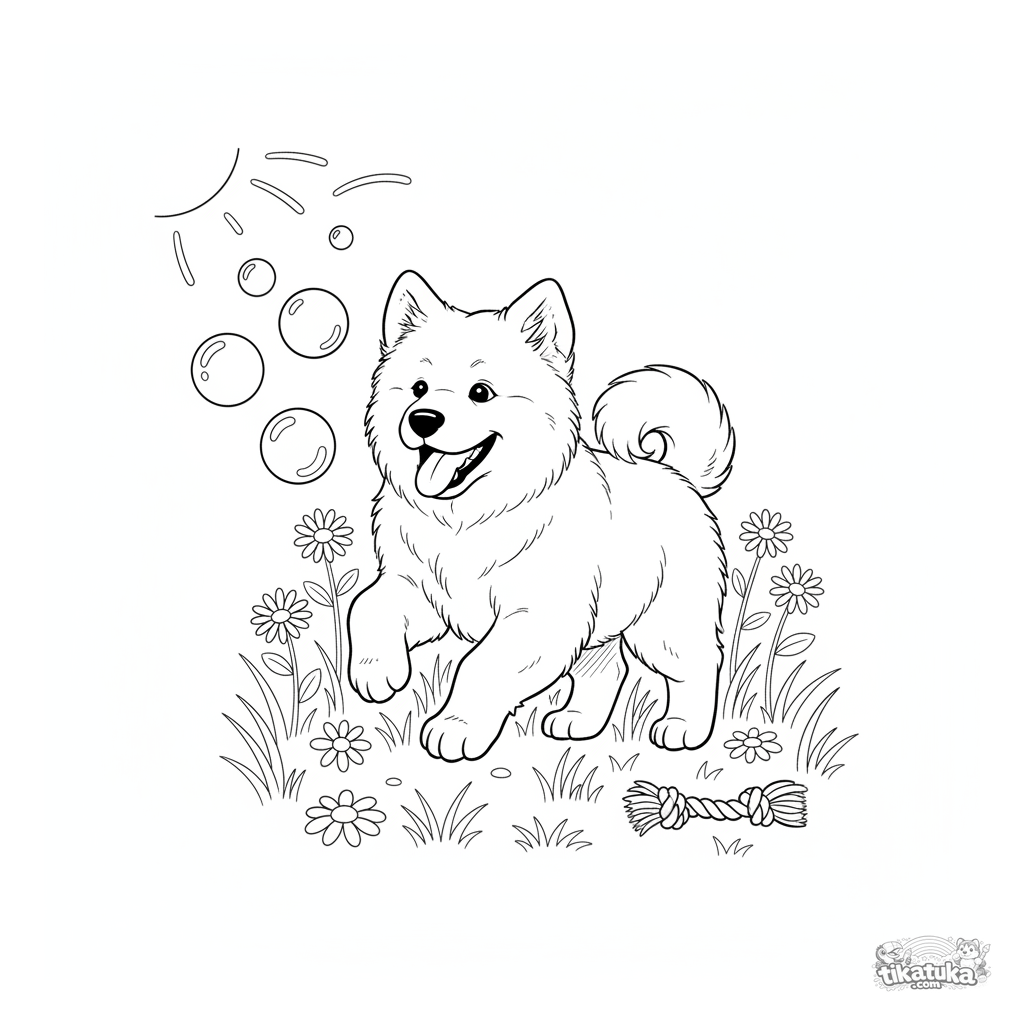 Página para colorear de un cachorro de Samoyedo esponjoso persiguiendo burbujas de jabón en un prado. Para niños de 3 a 6 años.