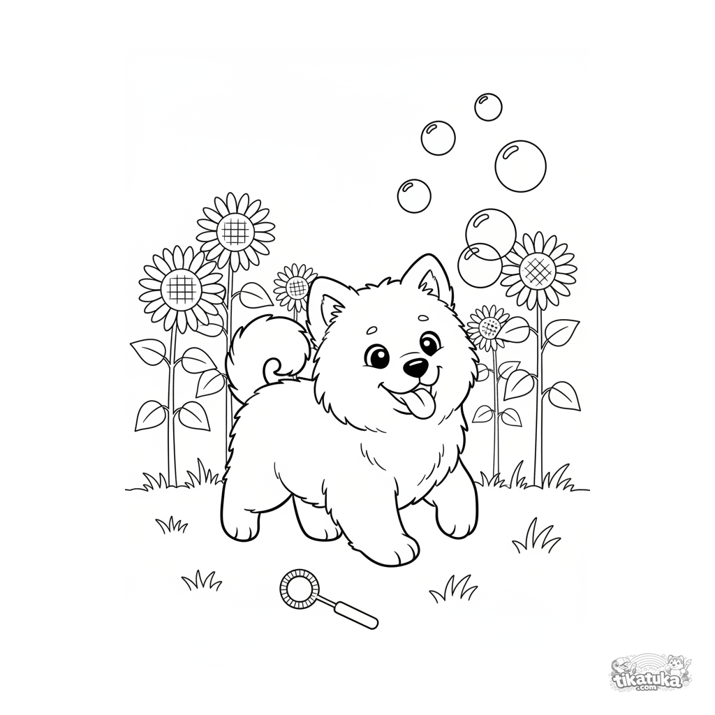 Página para colorear para niños: un cachorro de Samoyedo esponjoso persigue alegremente burbujas de jabón en un campo de girasoles. Para 5-7 años.