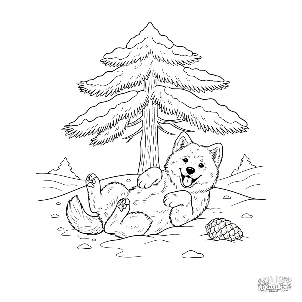 Página para colorear de un cachorro de Samoyedo esponjoso rodando feliz en la nieve bajo un pino. Para niños de 4 a 6 años.