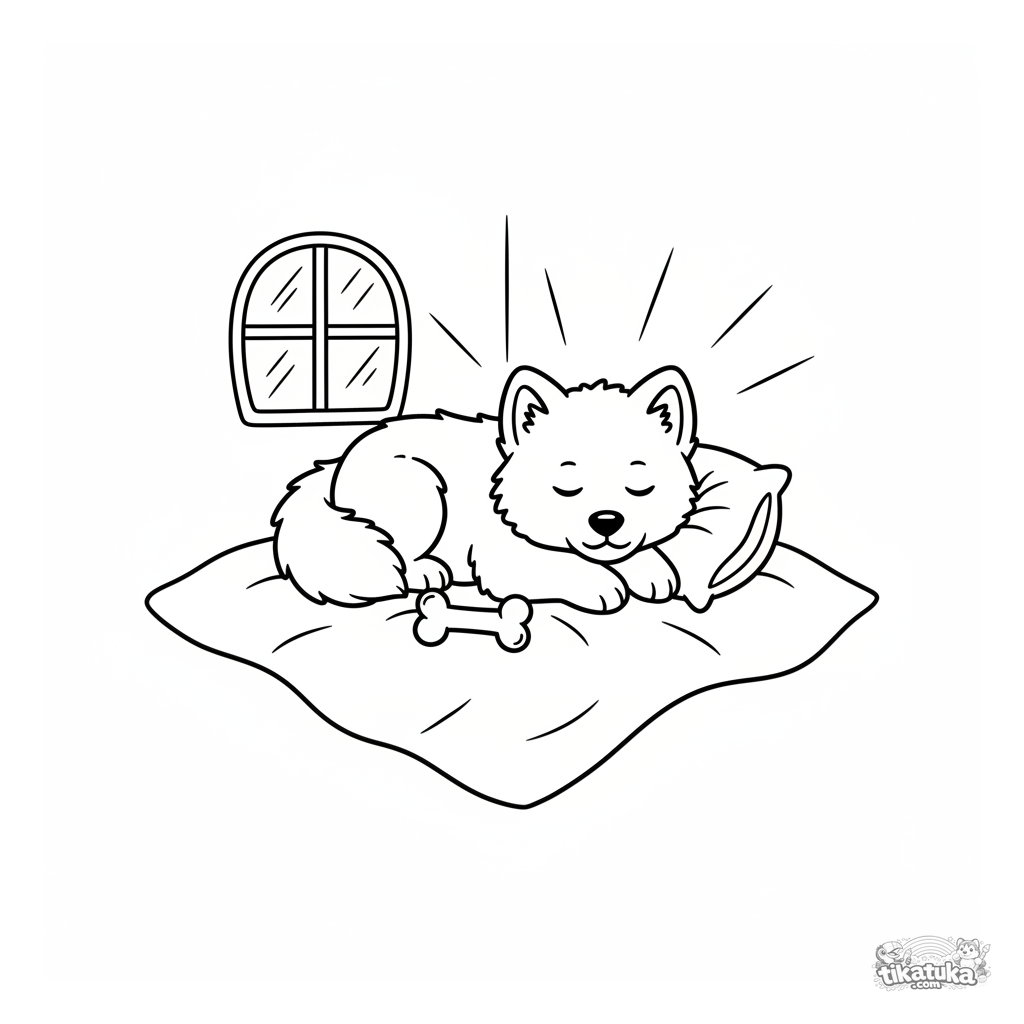 Página para colorear para niños pequeños: un cachorro samoyedo esponjoso durmiendo profundamente en una manta acogedora. Formas simples y grandes perfectas para niños de 2-3 años.
