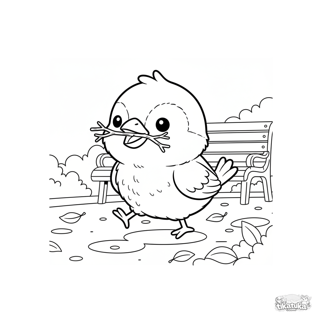 Página para colorear para niños de 4-6 años: un polluelo de gorrión esponjoso recoge ramitas para un nido en un parque urbano.