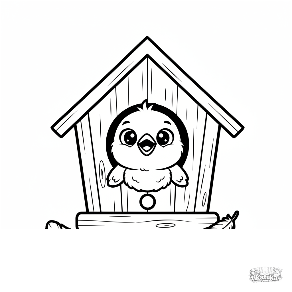 Página para colorear para niños pequeños: un polluelo de gorrión esponjoso asomándose por la ventana redonda de una casita de pájaros de madera.